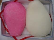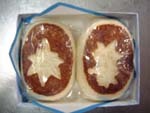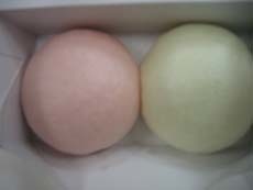 餅鳥ノ子 紅白のお餅です。熱を加えてお召し上がりください。この形は、鳥の雛が巣の中で丸くなっているところを模した物という説がある。各種お祝い事に使われます。